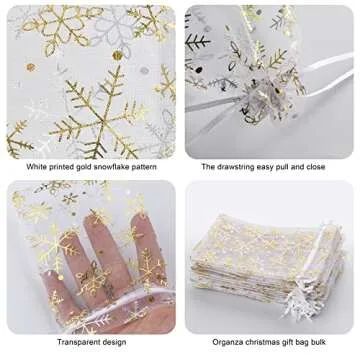 Show moreIntroducing the perfect solution for elegant gifting and unique presentations—the exquisite Snowflake Organza Gift Sachet Bags. Crafted with a beautiful translucent design and available in a pristine white, these bags are not just visually pleasing but also practical. Each organza bag measures approximately 10 x 15 cm (4 x 6 inches), making them ideally sized for a variety of uses, from party favors to jewelry packaging. With a convenient drawstring closure, your gifts are not only secure but also accessible at all times.