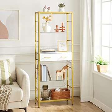 Show moreIntroducing the HOOBRO 5-Tier Bookshelf with Drawer, a perfect blend of style and functionality that will elevate your living space! Designed with a modern aesthetic, this tall bookcase not only provides ample storage for your books and magazines but also incorporates a convenient charging station to keep your devices powered up. With dimensions of 23.6"L x 11.8"W x 63"H, it features five open shelves complemented by a spacious drawer, offering both vertical space utilization and a delicate appearance. Crafted with a sturdy metal frame, thick tempered glass, and quality particleboard, this bookshelf ensures durability without compromising on style.