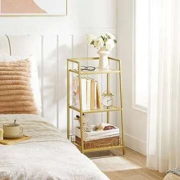 HOOBRO Glass Shelf Stand, 3 Tier Standing Shelf Unit, Bathroom Storage Organizer, Floor Bathroom Storage Shelves Waterproof, for Bathroom, Laundry, Toilet, Tempered Glass, Gold GD77CJ01