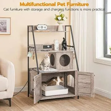 HOOBRO Litter Box Enclosure with 2 Storage Shelves, Tall Cat Litter Box Furniture Hidden with Charging Station, Indoor Cat Furniture with Cat House and Plush Mat, Greige BG70UMW01