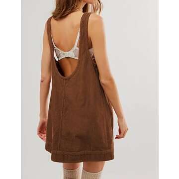 Hooever Women's Corduroy Overall Dress Round Neck A Line Skirtall Jumper Mini Dress Pinafore with Pockets(Brown-XS)