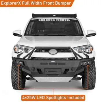 Show more Introducing the Hooke Road ExplorerX Front Bumper, specifically designed for 2014-2024 Toyota 4Runner 5th generation models, this full-width rock crawler bumper is the ultimate upgrade for off-road enthusiasts. Having a rugged and bold design, it provides an aggressive look while significantly enhancing your vehicle’s capability. With a unique 3-piece modular construction and a heavy-duty build made from 11-gauge steel, this bumper stands up to the most challenging terrains and adventures. Whether you’re tackling steep inclines or cruising down rough trails, the ExplorerX is engineered to deliver peak performance under tough conditions.