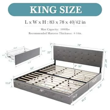 HOOMIC King Size Platform Bed Frame with 4 Storage Drawers, Adjustable Headboard with Square Stitched Button Tufted Design, Wooden Slats, No Box Spring Needed, Noise Free, Easy Assembly, Light Grey
