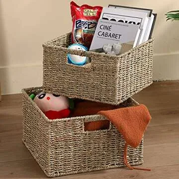 Show more Introducing the HOONEX Wicker Storage Baskets - a stunning solution for all your organization needs. These decorative woven seagrass baskets perfectly blend functionality with chic décor, making them an essential addition to any home. Designed to cater to a variety of uses, these baskets allow you to stylishly store everything from blankets and towels to crafting materials and pantry items, effortlessly enhancing your living space’s aesthetic. Their versatile nature makes them ideal for decluttering, providing a beautiful way to keep things neat and organized.