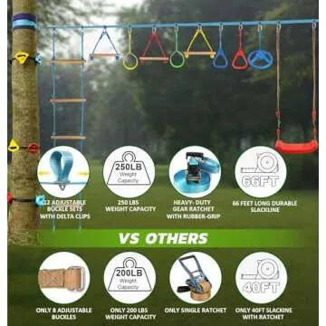 Safety is our top priority. The slackline can support a maximum load of 250 LBS, allowing kids and adults alike to engage in their favorite fun activities. With easy setup instructions and user-friendly video tutorials, you'll have your obstacle course ready in no time. Plus, the durable materials used mean it can withstand the test of time and the adventures of young explorers.