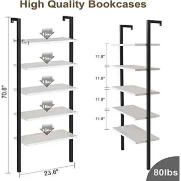 Show more Introducing the **Hooseng Open Wall Mount Bookcase**, a stunning embodiment of modern design fused with functionality. Crafted with a robust metal frame and reclaimed MDF wood, this 5-shelf ladder shelf holds the perfect balance of beauty and strength, making it an ideal addition to any space. When installed, it creates an enchanting visual with its minimalist aesthetic that enhances the ambiance of your living area without overwhelming it. Its impressive dimensions of **24"D x 12"W x 71"H** allow for a striking display while providing ample storage space. With a vintage look that's as attractive as it is practical, this bookcase is more than just a storage solution—it's a design statement in any home or office setting.