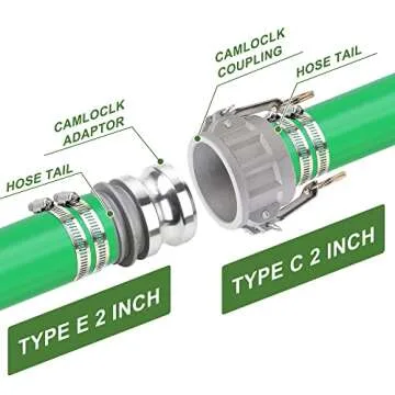 Show more The **HOOTSUM Camlock Fittings Type C and E** Aluminum 2” Cam and Groove Hose Fitting Kit is the ultimate solution for efficient fluid transfer in various applications. Designed for seamless connections between tanks, hoses, and piping, this kit includes **two versatile 2-inch fittings**—one female camlock and one male camlock—paired with hose shanks for a complete solution. Made from lightweight yet incredibly durable **high-tensile aluminum**, these fittings resist corrosion and tarnishing, ensuring long-lasting performance. Their user-friendly design allows for quick and simple installation—connect or disconnect without the need for tools! This makes the HOOTSUM Camlock fittings a must-have for anyone involved in fluid handling tasks, whether for water pumping or oil transfer operations.