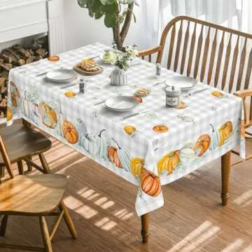 Show more The Horaldaily Fall Tablecloth is more than just a dining accessory; it's a celebration of autumn! Measuring a generous 60x84 inches, this rectangular beauty is adorned with a stunning Thanksgiving-themed watercolor pumpkin design and a unique blue buffalo plaid, bringing warmth and elegance to your table. Crafted from **100% spun polyester**, this tablecloth is not only visually appealing but also incredibly sturdy, designed to protect your tables from scratches, spills, and the harsh sun. With durable stitching and vibrant colors, it’s perfect for all your fall gatherings, be it a cozy dinner with family or a lively picnic with friends.