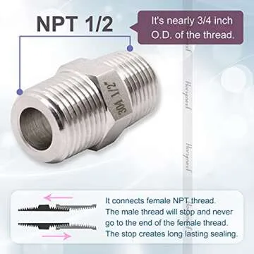 Show moreIntroducing the Horiznext NPT 1/2 Stainless Steel Hex Pipe Fitting, an essential accessory for any plumbing or gas connection project. This versatile fitting features a robust NPT 1/2 male thread design that ensures a secure and leak-proof connection for a variety of applications. Constructed from high-quality 304 stainless steel, it offers exceptional corrosion resistance, making it a reliable choice over traditional brass fittings that can often bend and break. Whether you're working on copper, brass, plastic, aluminum, or welded steel, this fitting is engineered to provide seamless compatibility and durability.