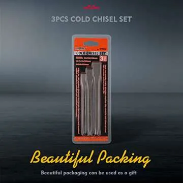Show moreDiscover the ultimate tool for both professionals and DIY enthusiasts with our premium 3PC Cold Chisel Set. Designed for those who demand efficiency and durability, this set includes three meticulously crafted chisels in various sizes: 3/8", 1/2", and 5/8". Each chisel is forged from heat-treated chromium vanadium steel, ensuring a remarkable hardness rating of 54-58 HRC, which resists rapid wear and keeps your tools in peak condition for a longer time.