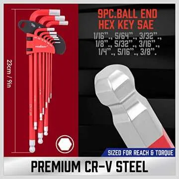 Show more Introducing the ultimate Hex Key Wrench Set, expertly crafted from high-quality chrome vanadium steel for unparalleled durability. With an advanced heat treatment process, these wrenches promise exceptional anti-corrosion and rust resistance, ensuring they will be your trusty companion for years to come. Each wrench is designed with a ball end, allowing you to effortlessly access socket cap screws at up to a 25-degree entry angle. Reach those challenging spots with ease and adjust fasteners from every angle without struggle.