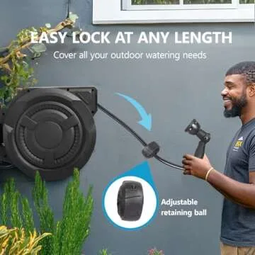 Show moreIntroducing the ultimate solution for your gardening needs - the Hose Reel 1/2 in x 100 ft. This stylish, wall-mounted garden hose reel is not only a practical addition to your outdoor space but also enhances its aesthetic appeal with its sleek black design. Say goodbye to tangled hoses and time-consuming storage; our innovative hose reel features an intelligent auto rewind system that retracts the hose smoothly and safely with just a gentle tug. Constructed from high-quality, weather-resistant materials, this reel ensures longevity and performance, making it a must-have for every garden enthusiast.