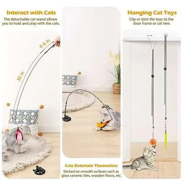 HOSFROLL Cat Toys, 2 Pack 3 in 1 Interactive Cat Toy for Indoor Cats with Sticky Super Suction Cup Detachable 10 Pcs Replacements Feathers Balls Mice 2 Wand Hanging Door Kitten Toys