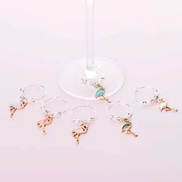Show moreIntroducing a delightful addition to your wine accessories - a set of 6 beautifully crafted wine glass charms featuring an elegant flamingo design. These charming identifiers are perfect for any occasion, ensuring that your stemmed wine glasses stand out while adding a unique, delicate touch. The vibrant colors and intricate designs of these flamingos not only enhance the aesthetic appeal of your drinks but also serve as great conversation starters at any gathering.