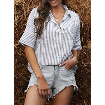 HOTAPEI Womens White Work Blouses Ladies Summer Casual V Neck Striped Short Sleeve Black Button Down Collar Chiffon Shirts and Blouse with Front Pockets Size Medium