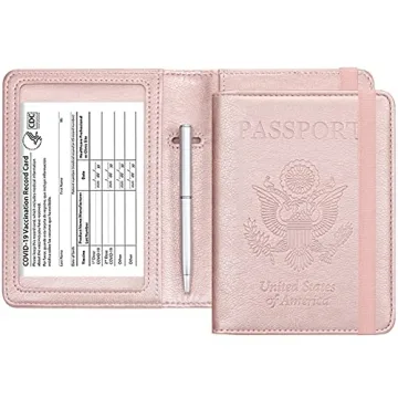 HOTCOOL Leather RFID Blocking Passport & Vaccine Card Holder with Pen - Rose Gold