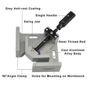 Show more Introducing the Hoteche Corner Clamp, the ultimate tool for precision woodworking and welding! Crafted from premium aluminum alloy die-casting material, this corner clamp boasts exceptional durability and strength, ensuring it stands the test of time even under heavy-duty use. Designed with a maximum clamping range of 2.75 inches (70mm) and a jaw width of 4 inches (95mm), this versatile clamp is perfect for connecting various thicknesses of wood blocks at a perfect 90-degree angle. The intelligent swing jaw design enables single handle jaw two-way rotation, allowing for precise clamping that adapts to your project needs seamlessly.