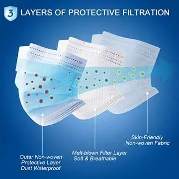 Show moreIntroducing the Hotodeal 50 Pcs Disposable Face Masks, a premium solution for breathability and comfort in essential health and daily activities. These masks are crafted from high quality non-woven fabric, featuring a unique three-layer design that ensures optimal protection without compromising on comfort. The outer layer offers waterproof properties to shield against moisture, while the middle layer effectively stops particles, and the inner layer absorbs moisture from your breath, keeping you dry and comfortable throughout the day. With dimensions of 6.8 inches in length and 3.7 inches in width, these masks fit most adult faces securely, thanks to the adjustable metal nose clip bridge and soft, elastic ear loops that provide focused support without irritation.