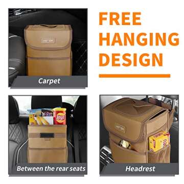 HOTOR Car Trash Can with Lid, Brown, 2 Gallon Capacity, Waterproof and Leak-Proof Design, Magnetic Snaps for Easy Replacement of Trash Bags