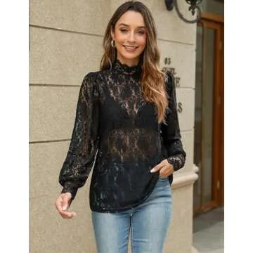 HOTOUCH Sheer Tops for Women Lace Dressy Night Out Blouses Black Plus Size Lace Shirts with Cami Long Puffy Sleeve Tunic Ruffle Neck Spring Going Out Black S