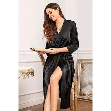 HOTOUCH Womens Bride Bridesmaids Satin Wedding Kimono Bridal Robe Long Luxury Sleepwear Lounge Robe A-Black Small