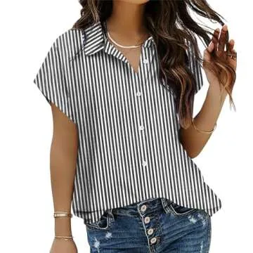 Show more Introducing the HOTOUCH Women's Cap Sleeve Striped Button Down Shirt, your new go-to for style and comfort during the warmer months! This classic collared cotton blouse is expertly crafted from 100% cotton, featuring a unique blend that incorporates natural crinkle linen texture. This thoughtful design not only contributes to a stunning appearance but also ensures that the shirt is incredibly breathable and durable. Perfect for those sunny Spring and Summer days, it offers a light and airy feel, with moisture-wicking properties that keep you cool and comfortable all day long.