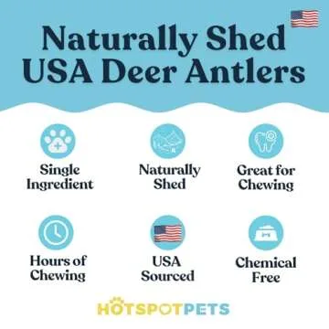 Show more Introducing the Hotspot Pets Premium Deer Antlers for Dogs - a must-have treat for your beloved canine companions! Available in a convenient two-pack, these large antler chews are perfect for dogs who love to chew and require durable, long-lasting snacks. Measuring between 7 to 8 inches, each antler is hand-selected to ensure top-notch quality, making them an ideal fit for large breed dogs and aggressive chewers. Crafted from naturally shed deer antlers, our chews not only satisfy your dog's natural chewing instincts but also promote dental hygiene by helping to clean teeth and gums as they chew.