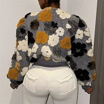 Show more Introducing the HOULENGS Women’s Cropped Floral Print Fleece Bomber Jacket, the perfect blend of comfort and style for the chilly months ahead. Made from 100% high-quality polyester, this lightweight jacket is designed to be soft and skin-friendly, ensuring you stay warm without compromising on style. With its trendy cropped length and eye-catching floral print, this jacket is not just a piece of outerwear, but a fashion statement. The puff sleeves and ribbed cuffs add a touch of sophistication, making it an ideal choice for both casual outings and more formal gatherings. Whether you’re heading to a party or just out for a casual day, this jacket will have you looking chic and feeling comfortable.