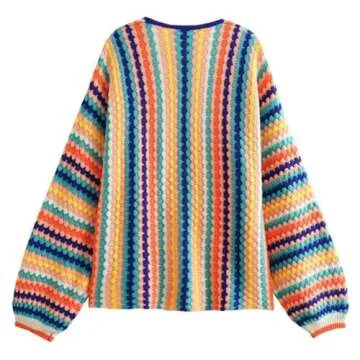 Show more Introducing the exquisite Loose Rainbow Print Boho Cardigan Sweater, a vibrant addition to any woman's wardrobe that perfectly blends comfort and style. Crafted from high-quality fabric, this cardigan is not only breathable but also features a stretchable design that allows for ease of movement. With its eye-catching rainbow print, it effortlessly elevates any casual outfit, making it a must-have for fashion-savvy individuals. A V-neck and long sleeves give this sweater a classic silhouette, while the crochet knit design adds a unique flair. The open front style allows for easy layering, providing a cozy yet chic look.
