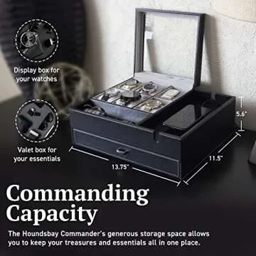 Show more Introducing the ultimate solution for watch aficionados and those who appreciate organization: the Commander Dresser Valet Box by HOUNDSBAY. This meticulously designed valet box is more than just an accessory; it is a statement of elegance and functionality. Crafted with high-quality materials, this organizer combines a generous charging station with a catchall tray, accessory drawer, and large-slotted watch case, all conveniently housed under a stunning real glass display lid.
