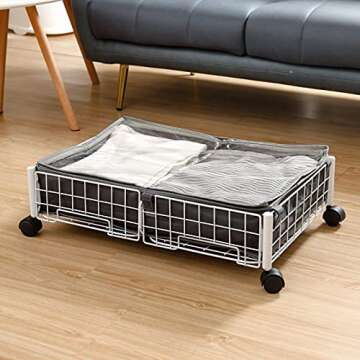 Show moreDiscover the ultimate storage solution with the HOUSE AGAIN 2-in-1 Under Bed Storage with Wheels. This innovative product is designed to transform your cluttered spaces into organized havens, boasting a rugged metal frame that can support an impressive 40 lb capacity. This makes it not only durable but also ideal for heavy-duty storage needs, ensuring that your belongings are securely housed and easily accessible. Measuring at 24 x 16 x 6.5 inches, these storage carts are perfectly crafted to fit under most beds, maximizing even the tightest spaces in your home.