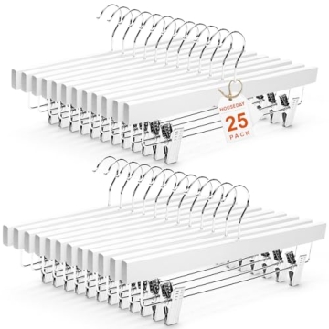 Introducing the HOUSE DAY Premium Wooden Pants Hangers, designed for a sophisticated and organized closet experience. Each pack contains 25 high-quality hangers crafted from solid lotus wood, featuring adjustable clips that ensure your garments remain securely in place. The unique texture and color variations of natural logs add an elegant touch, while an extra layer of lacquer enhances both durability and aesthetic appeal. These hangers not only maintain their pristine appearance but also...