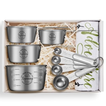 Show moreWelcome the new homeowners in your life with a thoughtful and practical gift that speaks to their new beginning. This beautifully curated set of engraved measuring cups, spoons, and kitchen towel is designed to add a personal touch to a new kitchen. Constructed with high-quality materials, the measuring cups come in four different sizes—1 cup, 1/2 cup, 1/3 cup, and 1/4 cup—allowing for precision in every recipe. The measuring spoons include 1 tablespoon, 1 teaspoon, 1/2 teaspoon, and 1/4 teaspoon, perfect for baking or cooking. They are made from food-grade, extra thick stainless steel, ensuring durability and elegance in cooking tasks.