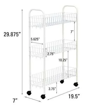 Show more Introducing the perfect solution for your storage needs—the Three-Tier Metal Utility Shelf! This sleek shelving unit, designed with a contemporary white finish, is not just a functional storage solution, but a stylish addition to any part of your home. Measuring at 30”H x 20”W x 7”D, it fits expertly in narrow spaces, making it ideal for placement between your washer and dryer or nestled in a petite bathroom corner.
