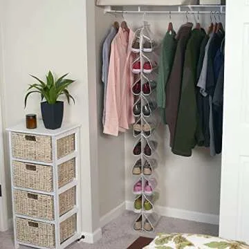 Show moreIntroducing the **Household Essentials 311390 Hanging Shoe Storage Organizer**, a game-changer for anyone looking to declutter and organize their closet space. This 20-pocket beauty is crafted from a robust and smooth natural canvas that not only enhances the aesthetic of your closet but also promises durability for long-term use. Measuring 62 inches in height, 10 inches in width, and 12 inches in depth, it perfectly balances size and capacity, allowing it to hold up to 20 pairs of shoes—making it an ideal choice for shoe enthusiasts and those with limited storage space alike. The all-important clear plastic sides make it easy to see and access your footwear, transforming chaos into order with just a simple glance.