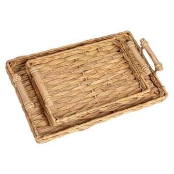 Show more Immerse yourself in the warmth of nature with the Household Essentials Handwoven Water Hyacinth Rectangular Tray Set with Wood Handles. This charming set isn't just for serving; it’s a statement piece crafted from handwoven water hyacinth fibers that boast a rustic yet elegant appearance. Each tray features solid wood handles that contrast beautifully with the natural texture of the trays, providing both functionality and style. Measuring 15.75 inches long, 9.75 inches wide, and 3 inches high, these trays are perfectly designed for versatility in your home.