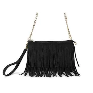 HOXIS Fringe Cross Body Bag Womens Small Shoulder Bag Top Zip Wristlet Black