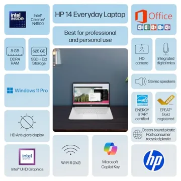 Show more Introducing the HP 14" Laptop, a perfect blend of performance and portability designed for students, professionals, and business use in 2026. With its thin and light design, this laptop is incredibly easy to carry, making it ideal for on-the-go use. Equipped with an Intel Celeron N4500 Processor that reaches speeds of up to 2.8GHz, you'll experience smooth multitasking to meet all your daily computing needs. The laptop features 8GB DDR4 RAM and a flexible storage solution combining a speedy 128GB SSD with an additional 500GB external drive, ensuring you have ample space for files, applications, and media.