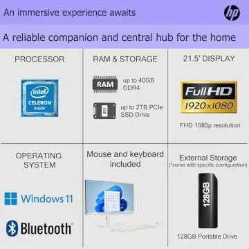 Show more Experience outstanding computing with the HP All-in-One Desktop, designed for versatility and efficiency. At the heart of this machine is the Intel Celeron J4025 processor that offers a burst frequency of up to 2.9 GHz, making it ideal for handling everyday tasks smoothly, whether you're browsing the internet, checking emails, or streaming your favorite shows. Pre-installed with Windows 11 Pro, this desktop ensures you have the latest features right out of the box. With its sleek design and a stunning 21.5" Full HD display, enjoy vibrant visuals with anti-glare technology that reduces eye strain during long hours of use.