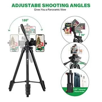 The tripod comes equipped with a mobile phone holder that adjusts from 3.3-3.93 inches, ensuring compatibility with most smartphones and cases. Its wireless remote shutter allows you to take photos from up to 10 meters (33 feet) away, providing freedom and flexibility for remote shooting.