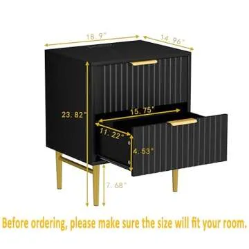 HQZX Black Nightstand Set of 2 with Charging Station, Fluted Nightstand with Drawers, Modern Bedside Table with Gold Legs, End Table for Bedroom