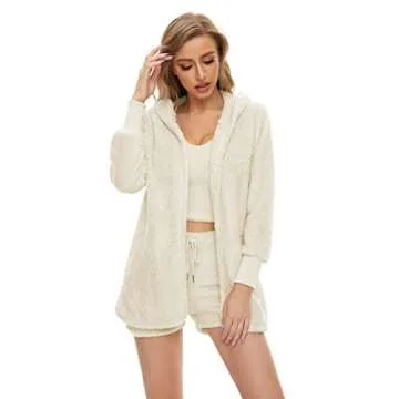 HRESSLBD Women's Fuzzy 3-Piece Lounge Sets Tank Tops Cardigan Shorts Fleece Pajamas Set, Cozy 3 Piece Fuzzy Fleece Warm Outfits for Women (Cream White, S)