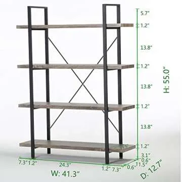 HSH 4-Shelf Vintage Industrial Bookshelf, Rustic Gray Wood and Metal 4 Tier Bookcase, Open Wide Etagere Book Shelf for Home Office Livingroom Bedroom Dispaly, Light Grey Oak