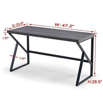 Show more Introducing the perfect blend of minimalism and industrial design, this stunning gray computer desk is an ideal addition to any workspace. Constructed with heavy-duty metal K-shaped legs and a robust 1.57'' thick tabletop, this desk ensures stability and durability that lasts. Measuring an impressive 47.2''W x 23.6''D x 29.5''H, it boasts a significant weight capacity of up to 300 lbs, making it suitable for both work and play. Its unique gray vintage finish and wood grain texture not only enhance the aesthetic appeal but also create a rustic charm that complements diverse settings.