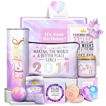 Show moreSurprise the special girl in your life with the ultimate 13th birthday gift that she will absolutely adore! Our beautifully curated gift box is a treasure trove designed to evoke feelings of joy and warmth. Carefully arranged, each item within the box symbolizes cherished moments and thoughtful gifting. From the exquisite “Sweet 13” stainless steel tumbler to a delightful bath bomb, every piece is selected to create a magical birthday experience. This gift set is ideal for girls, girlfriends, daughters, sisters, and friends celebrating this special milestone, making it a remarkable choice for 13th birthdays.