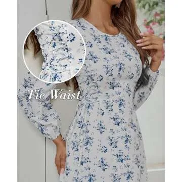 HTZMO Women's Puff Long Sleeve Floral Maxi Dress Tie Waist Flowy Swing 2025 Casual Summer Long Dresses White M