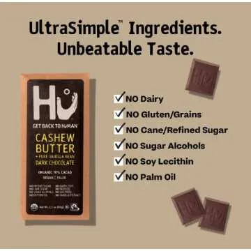 Show more Introducing a delight for chocolate lovers seeking a healthier, guilt-free option! Our chocolate bars are crafted by Hu, a brand that prioritizes clean and wholesome ingredients. With a commitment to quality, these bars are proudly Paleo, Vegan, and Organic, ensuring you indulge without the worry of harmful additives. Say goodbye to conventional chocolates laden with dairy, soy, gluten, and refined sugars. Each bar is an invitation to Get Back to Chocolate without compromising your health. Our bars are formulated with care, using natural ingredients that nourish rather than hinder your journey towards wellness.