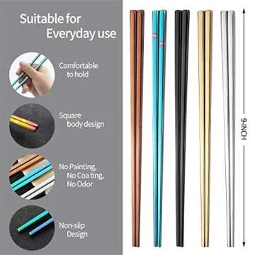 Elevate your dining experience with the HuaLan Metal Chopsticks, a stunning set crafted from high-quality 18/8 stainless steel that combines elegance and functionality. Perfectly designed for both seasoned chopstick users and novices, these chopsticks offer a unique, square body shape that provides a comfortable grip, tackling the age-old challenge of wielding round chopsticks, especially for beginners. With a length of 9 inches, they fit perfectly in your palm, making them versatile for...