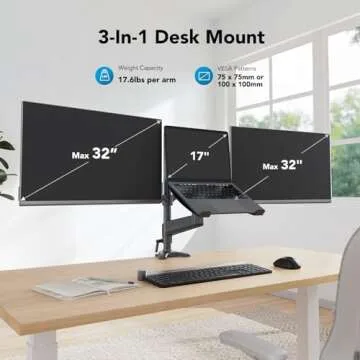 Show more Enhance your workspace with the revolutionary 3 in 1 Monitor and Laptop Stand, expertly designed for optimal efficiency and ergonomic comfort. This Dual Monitor mount effortlessly accommodates two 32-inch monitors, weighing up to 17.6 lbs each, alongside a 17-inch laptop, ensuring a more integrated work experience without breaking the bank. With a user-friendly customization system, you can adjust the positions of your monitors and laptop to suit your individual needs, promoting a healthy posture during long hours of work.