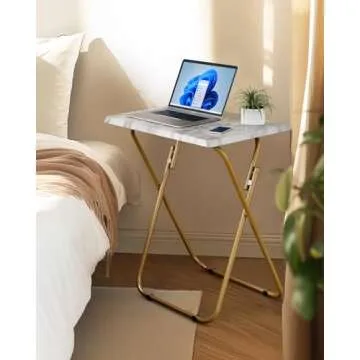 Show more Introducing the HUANUO Folding TV Tray Table—a reliable and attractive solution that enhances your home experience with style and functionality. Perfect for a range of activities, from having dinner while watching your favorite show to snack time during unforgettable game nights, this premium TV tray measures a convenient 18.8” in width and 14.9” in depth, making it versatile enough to hold anything from a full plate to a bowl of popcorn. The elegant faux marble top elevates the aesthetic of your living space, ensuring this isn't just another ordinary table but a statement piece in your home.